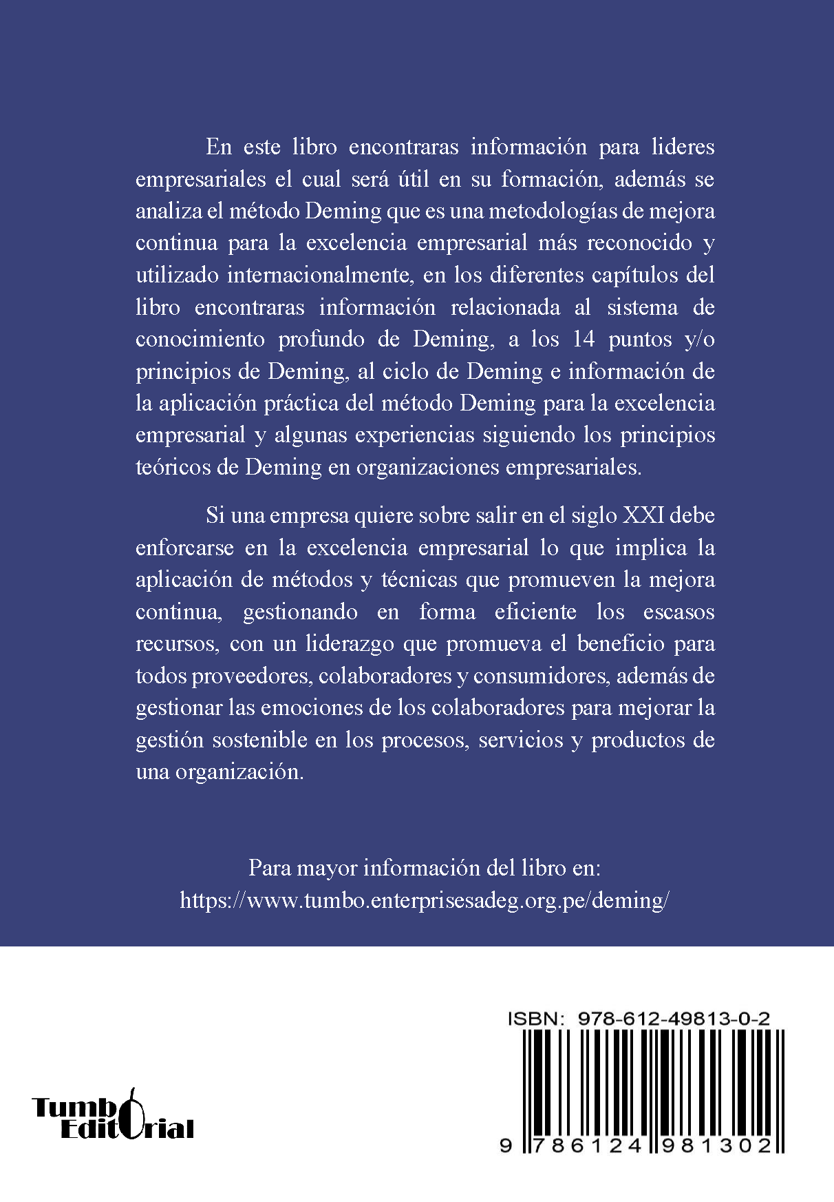 En este libro encontraras información para lideres empresariales el cual será útil en su formación, además se analiza el método Deming que es una metodologías de mejora continua para la excelencia empresarial más reconocido y utilizado internacionalmente, en los diferentes capítulos del libro encontraras información relacionada al sistema de conocimiento profundo de Deming, a los 14 puntos y/o principios de Deming, al ciclo de Deming e información de la aplicación práctica del método Deming para la excelencia empresarial y algunas experiencias siguiendo los principios teóricos de Deming en organizaciones empresariales.